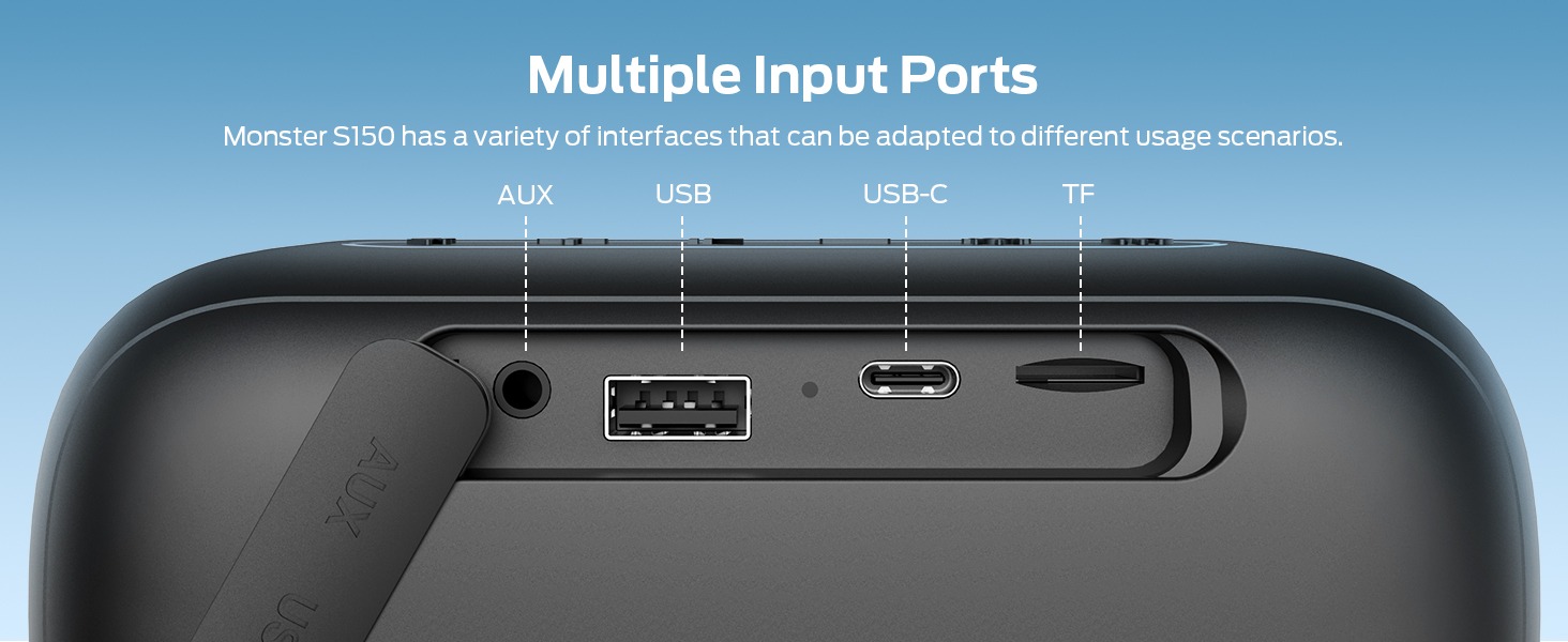 Loa Bluetooth Monster hỗ trợ nhiều phương thức kết nối: Bluetooth, thẻ TF, USB và AUX – mang lại sự linh hoạt tối đa cho mọi nhu cầu sử dụng, dù ở trong nhà hay ngoài trời.