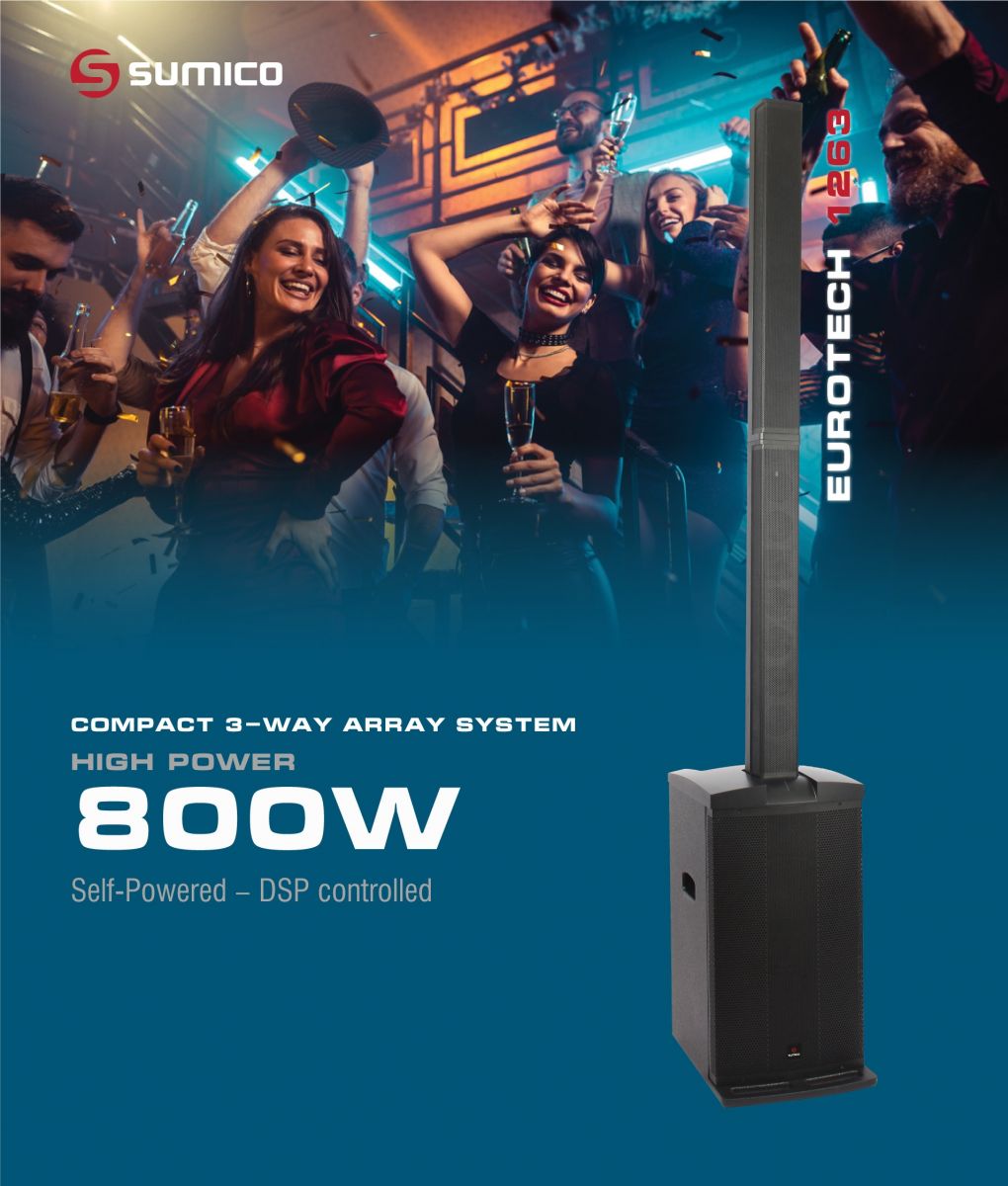 Sumico EUROTECH 1263 là loa Column Array Active di động 3 đường tiếng công suất 800W RMS, điều khiển bằng DSP, là giải pháp âm thanh thanh lịch cho các sân khấu nhỏ và vừa. Với thiết kế gọn nhẹ, Sumico EUROTECH 1263 là lựa chọn tối ưu cho cả nghệ sĩ biểu diễn live, công ty lắp đặt âm thanh chuyên nghiệp cũng như phòng Karaoke chất lượng cao. Loa là lựa chọn lý tưởng cho quán café, lounge, bar, sân khấu hát live và acoustic nhỏ, hội trường đa năng, cửa hàng bán lẻ, khán phòng, khu giải trí, nhà thi đấu, sự kiện biểu diễn lưu động nhỏ hoặc phòng Karaoke cao cấp.