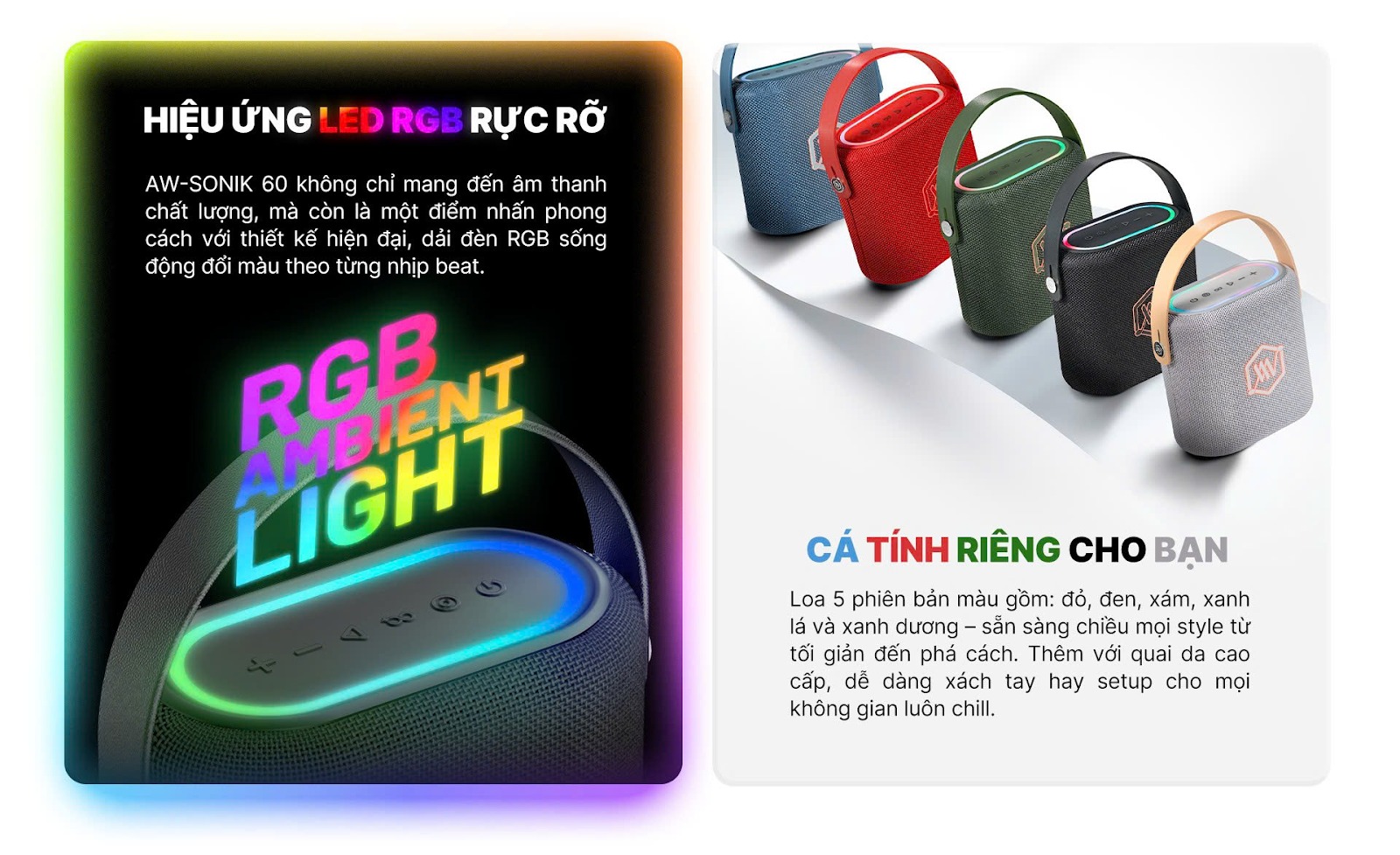 AW-SONIK 60 không chỉ mang đến âm thanh chất lượng, mà còn là một điểm nhấn phong cách với thiết kế hiện đại, dải đèn RGB sống động đổi màu theo từng nhịp beat. Thêm điểm cộng với quai da cao cấp, giúp bạn dễ dàng xách tay, treo balo hay setup cho mọi không gian chill.