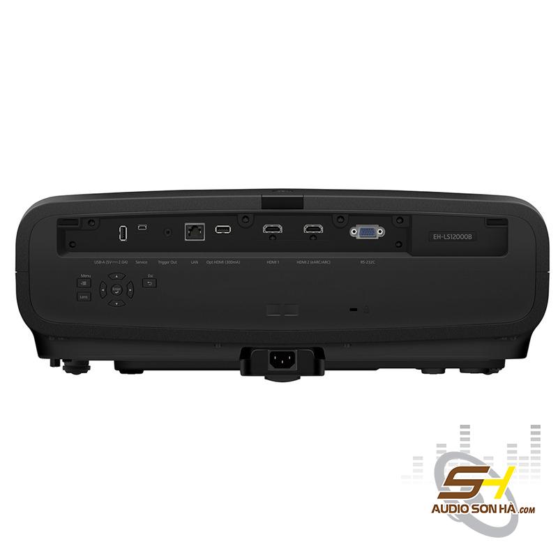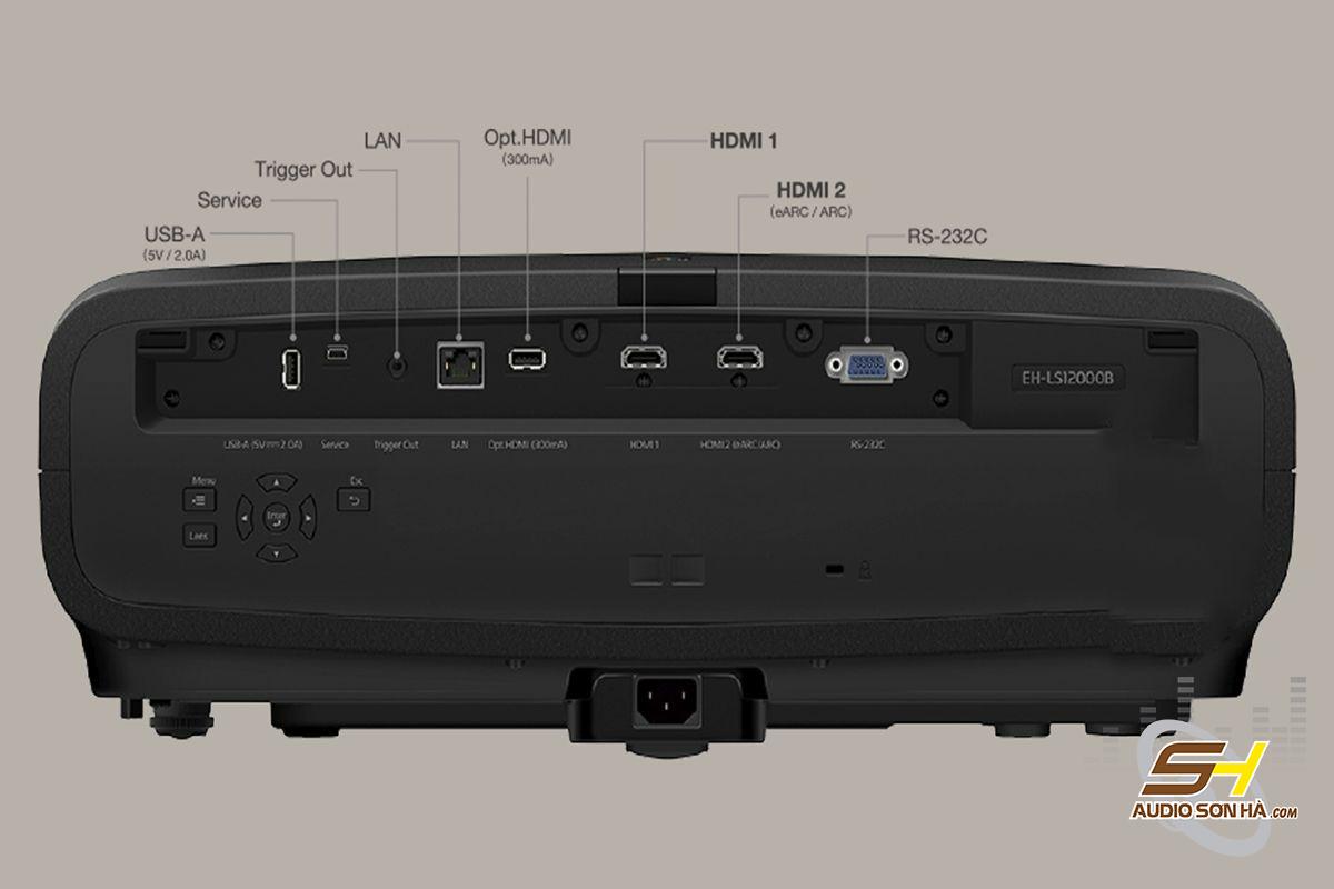 Máy Chiếu 4K Epson EH-LS12000B hỗ trợ đầy đủ các cổng ra/vào bao gồm: USB - A (5V/2.0A), Service, Trigger Out, LAN, Opt.HDMI (300mA), HDMI 1, HDMI 2 (eARC/ARC), RS-232C giúp bạn dễ dàng kết nối với các thiết bị khác một cách nhanh chóng và ổn định.