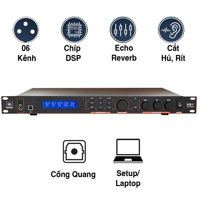 là mẫu vang số mới nhất được JBL ra mắt, được thiết kế nhỏ gọn, tinh tế và tối ưu cho thị trường KTV. Mixer JBL VX9 giúp xử lý giọng hát mạnh mẽ và tạo ra hiệu ứng âm thanh sống động. Với công nghệ hiện đại cùng bề dày kinh nghiệm từ JBL Professional, VX9 mang đến trải nghiệm giải trí chất lượng cao và ấn tượng cho người dùng. Tổng thể, vang số JBL VX9 là sự kết hợp hoàn hảo giữa thiết kế đẳng cấp, hiệu suất âm thanh ưu việt và khả năng kết nối đa dạng, đáp ứng tối đa nhu cầu của các cơ sở KTV hiện đại.
