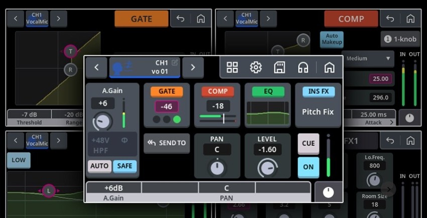 Mixer tích hợp hệ thống DSP xử lý thời gian thực với nhiều công cụ chuyên nghiệp. Người dùng có thể sử dụng EQ, Compressor, Gate, Reverb, Delay, Ducker và Amp Simulator trực tiếp trên mixer. Các hiệu ứng này giúp tinh chỉnh và định hình âm thanh nhanh chóng mà không cần thiết bị rời. Nhờ DSP mạnh mẽ, workflow trở nên gọn gàng và hiệu quả hơn đáng kể.