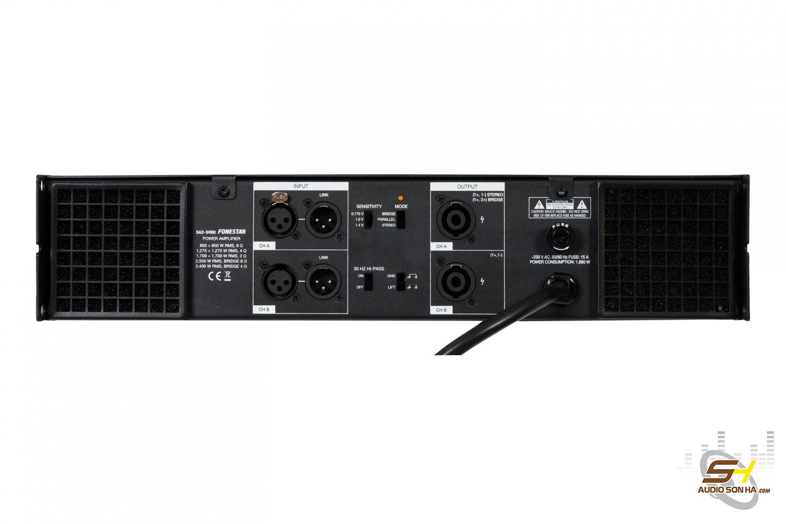 Bộ khuếch đại công suất chuyên nghiệp chế độ âm thanh nổi và song song: 850 + 850 W RMS ở 8 Ω, 1.275 + 1.275 W RMS ở 4 Ω, 1.700 + 1.700 W RMS ở 2 Ω; Chế độ cầu nối: 2.550 W RMS ở 8 Ω, 3.400 W RMS ở 4 Ω.