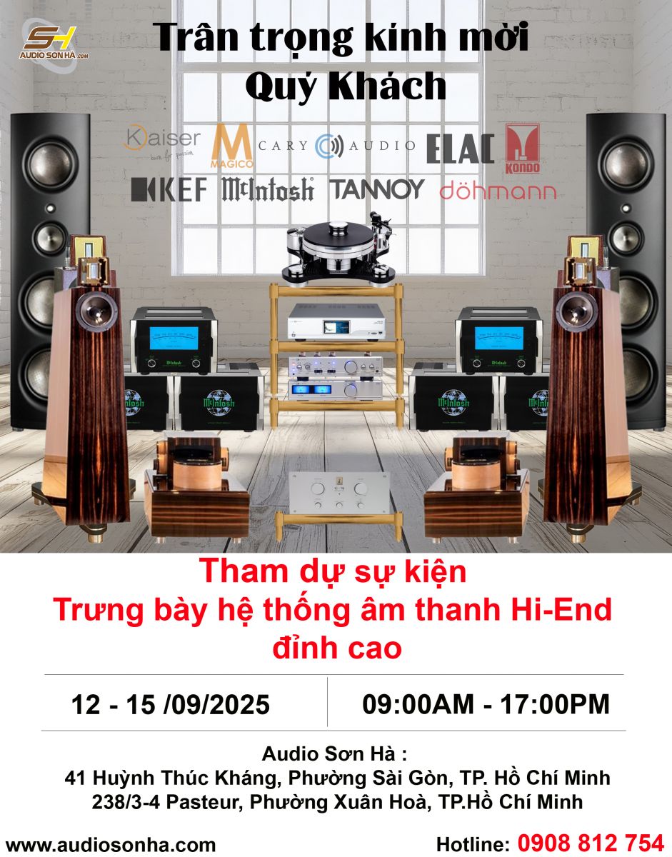 Từ ngày 12/09 đến 15/09/2025, Audio Sơn Hà hân hạnh mời bạn đến tham quan và trải nghiệm sự kiện trưng bày những Setup âm thanh Hi-End ấn tượng nhất. Sự kiện sẽ diễn ra từ 09:00 đến 17:00 tại hai địa điểm: 41 Huỳnh Thúc Kháng, Phường Sài Gòn và 238/3-4 Pasteur, Phường Xuân Hòa, TP. HCM. Đây là cơ hội có 1-0-2 để bạn được tận mắt chiêm ngưỡng, tận tai lắng nghe và so sánh các thiết bị âm thanh từ những thương hiệu hàng đầu thế giới.